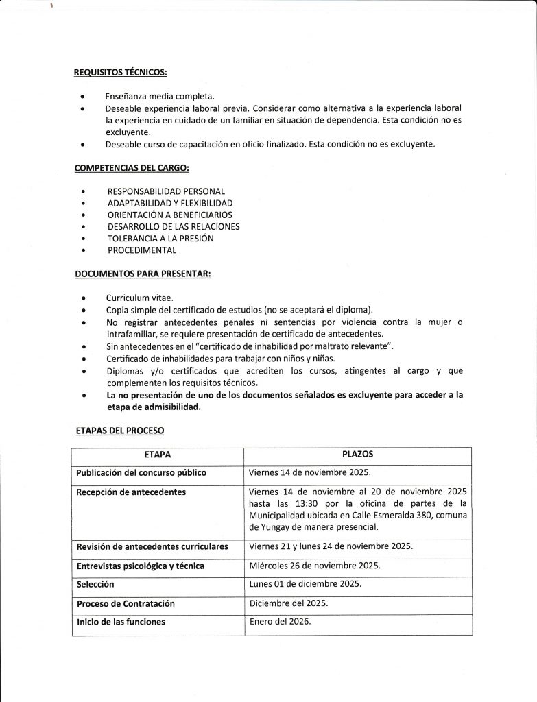 La Municipalidad de Yungay informa a la comunidad que se abre el Concurso Público 2025 para proveer 4 cargos de Asistente de Cuidados del Programa Red Local de Apoyos y Cuidados, iniciativa desarrollada en convenio con la Seremi de Desarrollo Social y Familia.