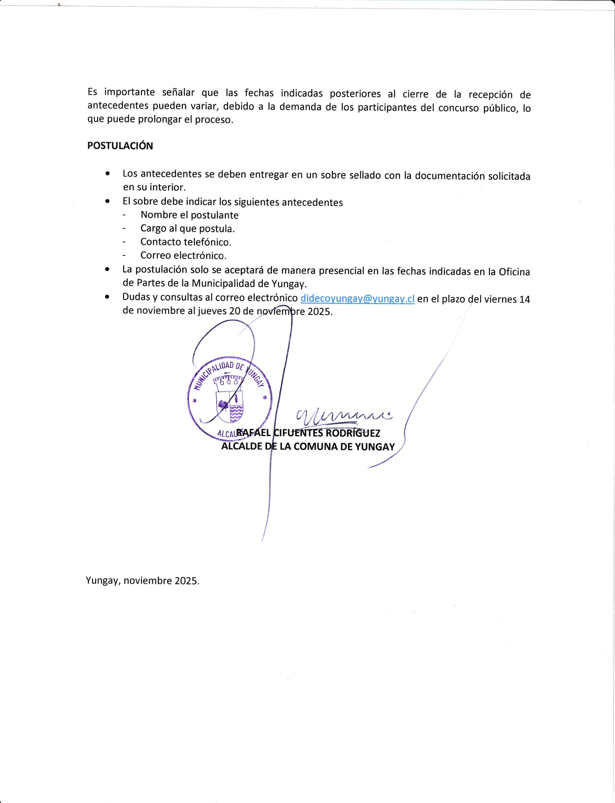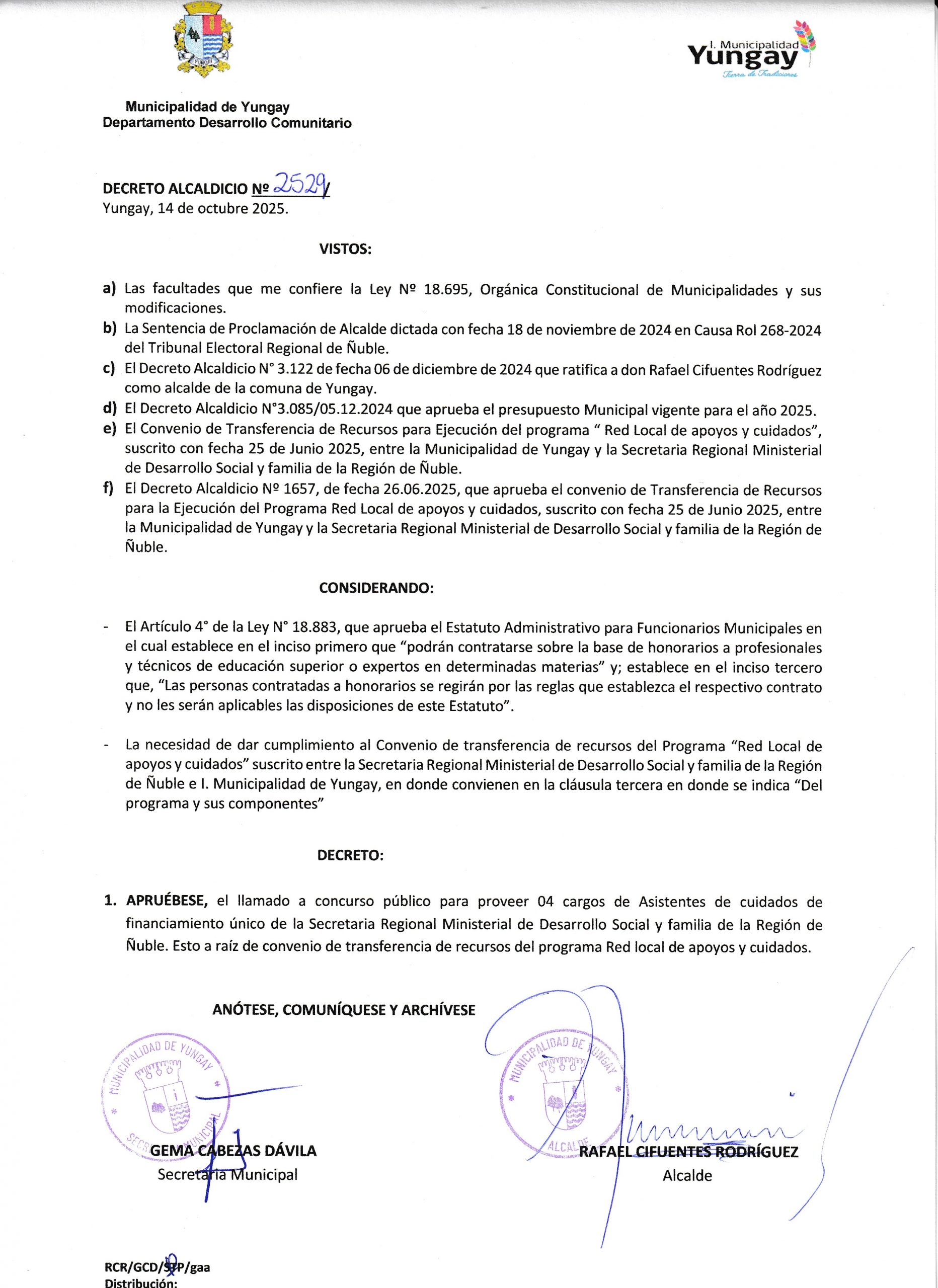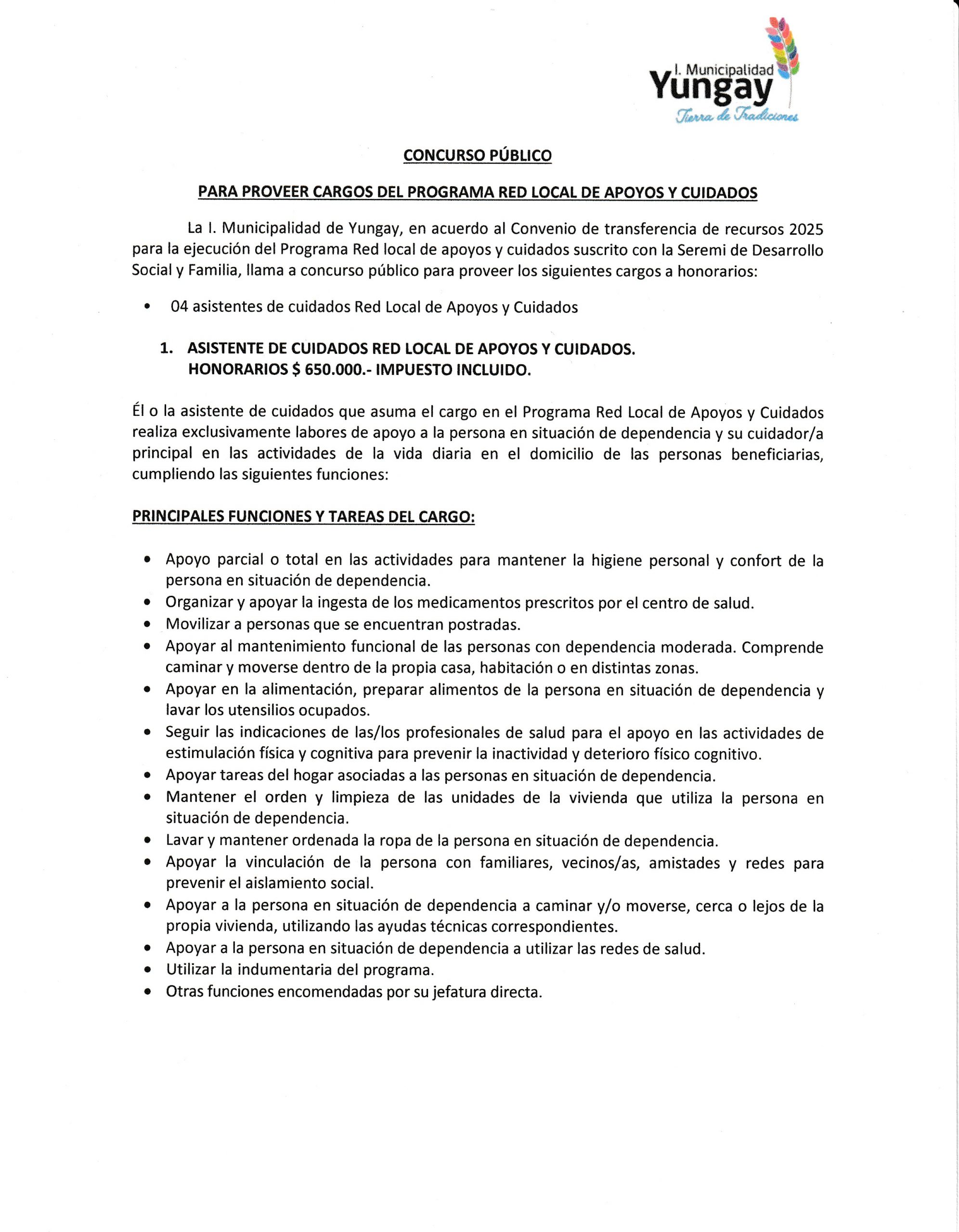 La Municipalidad de Yungay informa a la comunidad que se abre el Concurso Público 2025 para proveer 4 cargos de Asistente de Cuidados del Programa Red Local de Apoyos y Cuidados, iniciativa desarrollada en convenio con la Seremi de Desarrollo Social y Familia.
