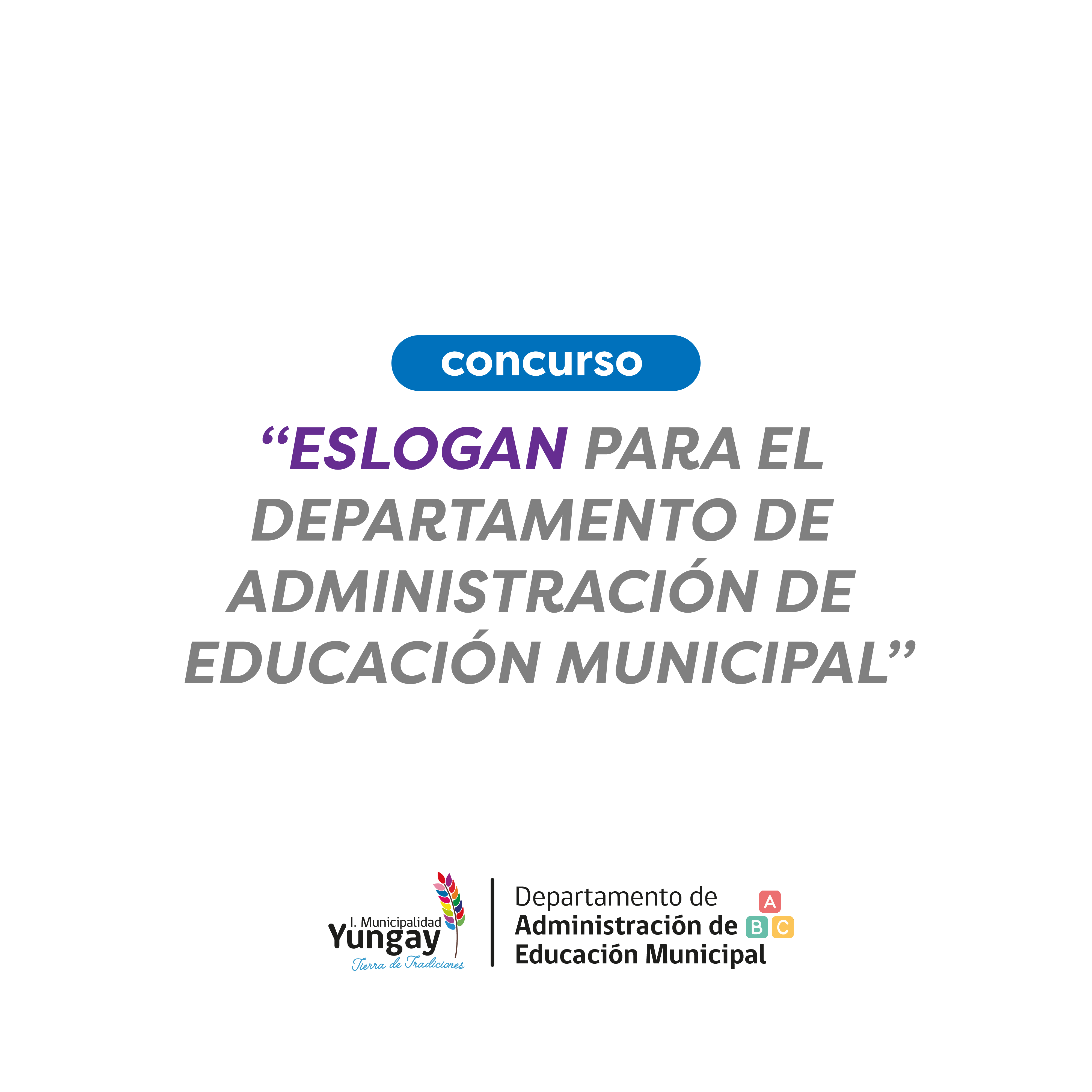 Fundamentación: Con motivo de acercar a la comunidad educativa de la comuna de Yungay, el Departamento de Administración de Educación Municipal, invita a todos sus establecimientos a participar del concurso “ESLOGAN PARA EL DEPARTAMENTO DE ADMINISTRACIÓN DE EDUCACIÓN MUNICIPAL” Objetivo: