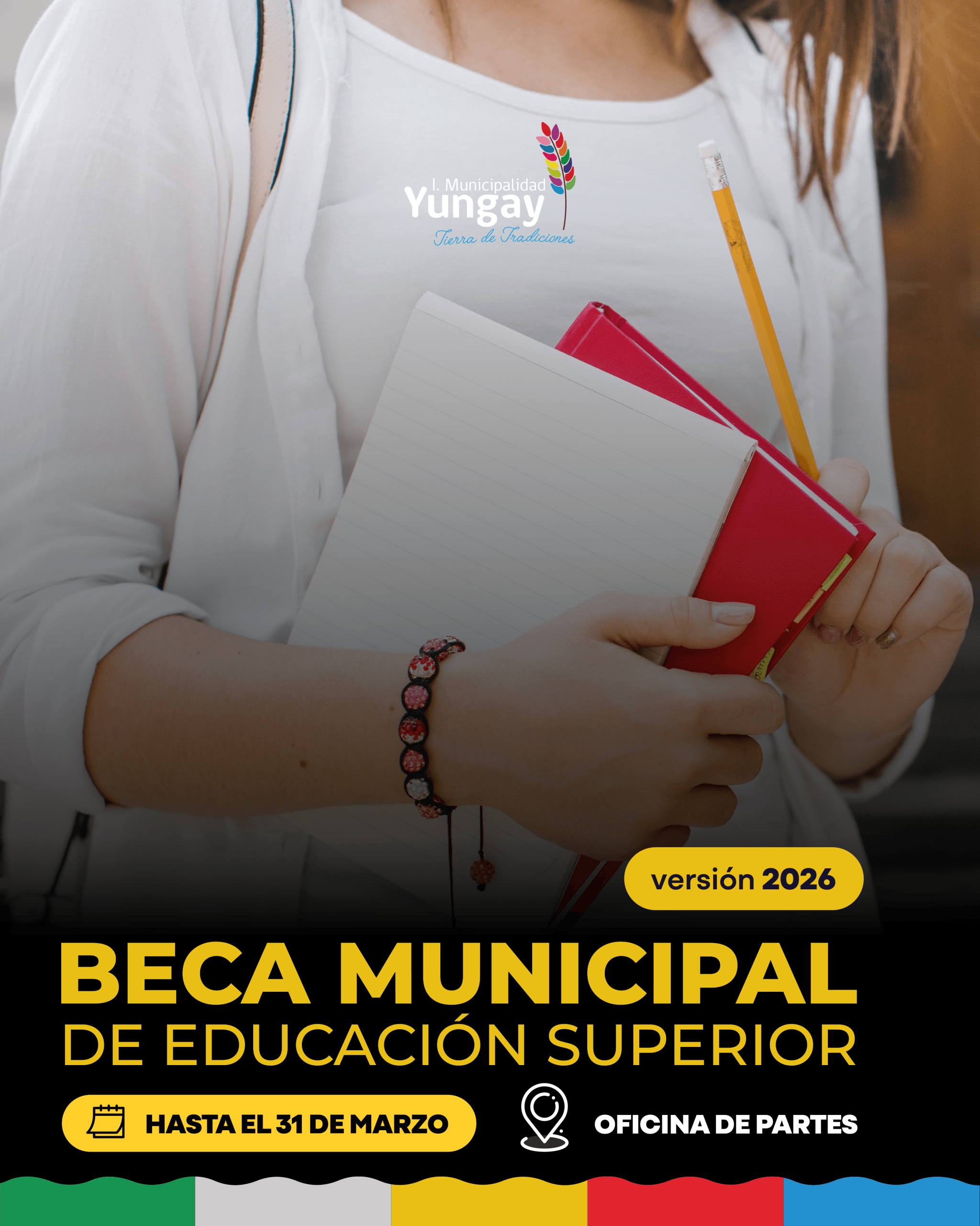 ¡Atención estudiantes de Yungay! Ya se encuentran disponibles las BASES para la postulación para la Beca municipal de educación superior. Postulación: Del 2 al 31 de marzo de 2026. Descarga las bases y formularios en www.yungay.cl o retíralos en la Dirección de Desarrollo Comunitario.